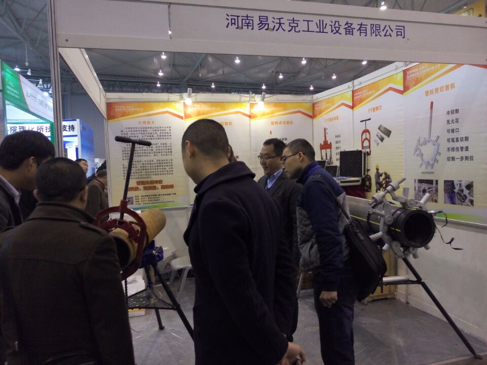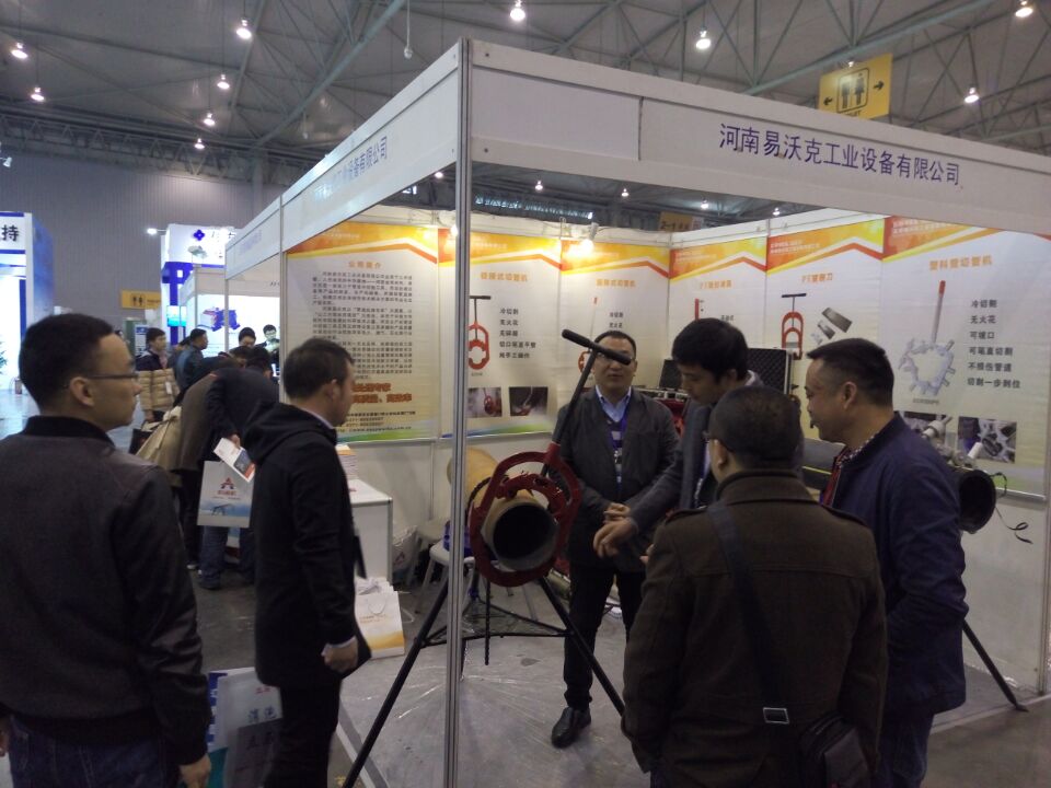 河南易沃克工業設備有限公司展位面前人頭攢動,異?;鸨ξ宜咀灾餮邪l的管道冷切割工具喜愛有加。工作人員向在場人員講解展示鋼管和pe管冷切割工具。以及pe刮皮刀,管道帶壓封堵器。參觀人員交口稱贊。